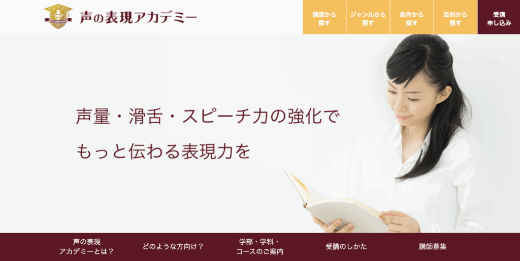 | 声の表現アカデミー | ![]() | 「声の表現を学べる」通信講座の学校 | 初心者や資格取得希望者 | 各コース8,800円 | 通信講座 | アナウンサーなど多数 | コース別の専門カリキュラム | なし |