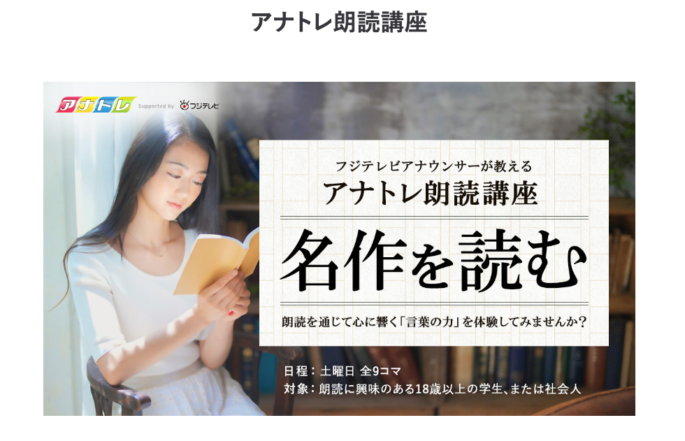 アナトレ朗読講座 | ![]() | フジテレビアナウンサーが教える朗読講座 | 朗読を通じて基礎を身につけたい人 | 受講料60,000円 | グループ | フジテレビアナウンサー | 時期別のクラス生 | 無料体験なし |