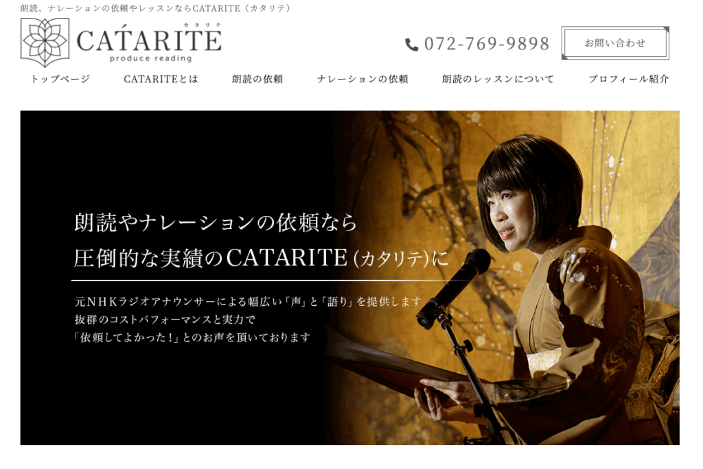 CATARITE(カタリテ)は、元NHKアナウンサーによる圧倒的な実績が魅力のスクールです。語りのブランドとして指導を行い、朗読が好きな方も苦手な方も話し好きになってしまうレッスンが魅力になります。