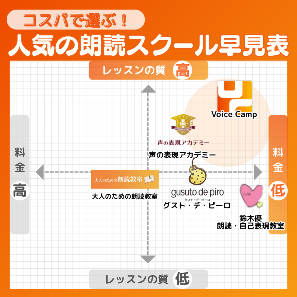 | グスト・デ・ピーロ | ![]() | 楽しい朗読教室 | 楽しく朗読を習いたい人 | 月8,000円~ | グループ/個人/オンライン | 現役ナレーター | 本をベースにしたレッスン | 無料体験なし |