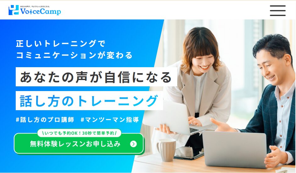 「Voice Camp(ボイスキャンプ)」は、オンラインでマンツーマンレッスンを受けられる話し方スクールです。自宅から受講できるため、忙しい社会人でもスケジュールに合わせて学びやすい点が特徴です。