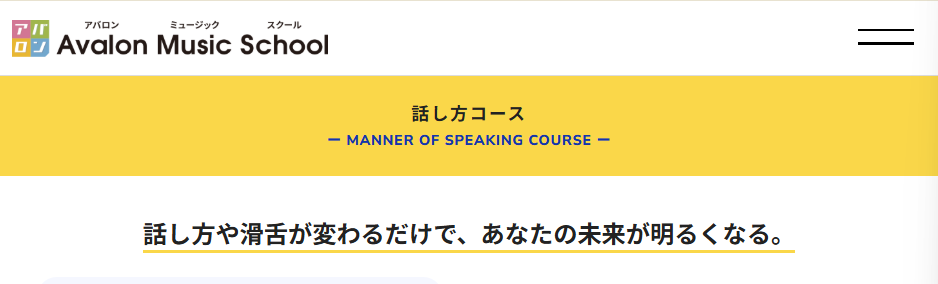 | アバロンミュージックスクール | 完全マンツーマンで話し方・滑舌を改善できるコース | 就活・プレゼンなどで話し方を改善したい方 | 入学金2,200円、45分月2回11,000円(税込)〜 | 完全マンツーマン(通学・オンライン) | 不明 | 発声法・呼吸法・滑舌・録音を用いた表現力改善 | 無料体験レッスンあり | |