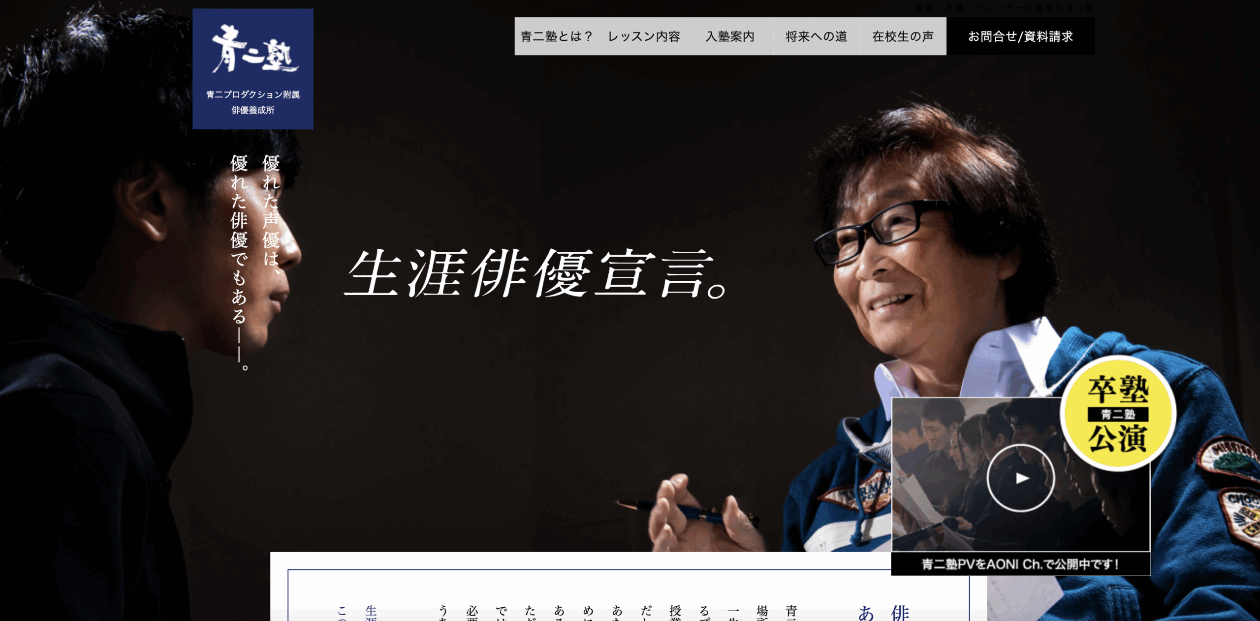 | 青二塾 | ![]() | 青二プロ直営の全日制養成所 | 高卒以上、20〜30代中心 | 入所金20万円+年間80万円前後 | クラス制週5回(240分) | 音響監督・所属声優 | 演技中心、俳優力育成 | 説明会あり |
