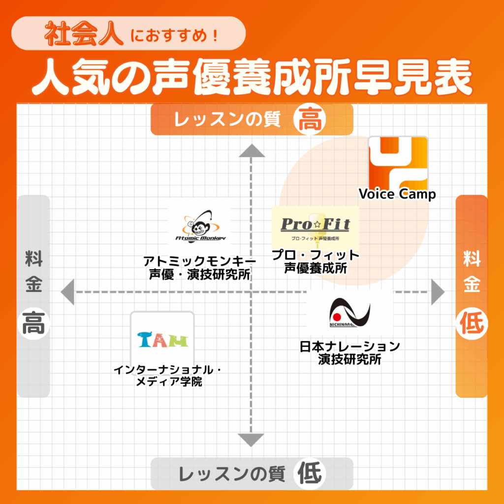 | プロ・フィット声優養成所 | ![]() | 少人数制で1年集中の実践重視 | 中学卒業以上、初心者可 | 入所金25万円+年間36万円(本科) | 少人数クラス制週1回(120分) | 音響監督・現役声優 | 台詞・朗読・マイク実習など | 説明会あり |