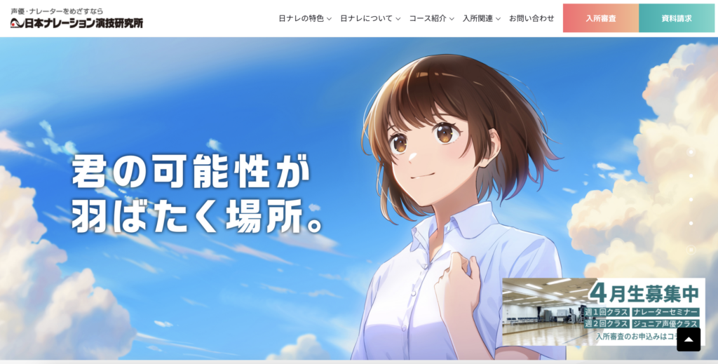 | 日本ナレーション演技研究所 | ![]() | 週1回から通える大手養成所 | 初心者〜経験者まで幅広い対象 | 入所金10万円+授業料年間20万円前後 | クラス制週1回(180分) | 大手事務所バックアップ | 発声・演技・アフレコ基礎から実践 | 説明会・資料請求可 |