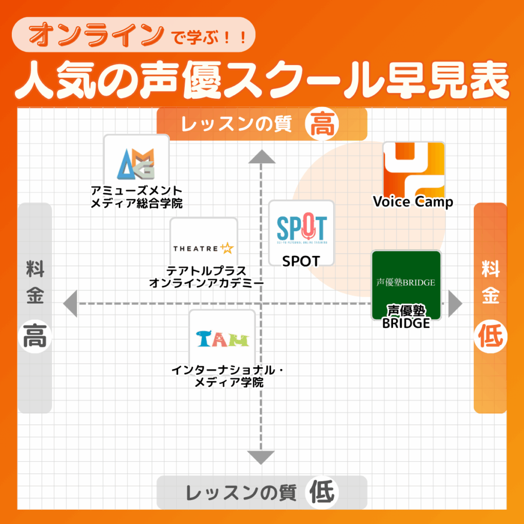 | アミューズメントメディア総合学院 声優オンライン専科 | ![]() | オンラインで受講できるコース | 声優を目指す人向け | 募集コースにより変動 | 少人数レッスン | 現役の声優講師 | 声優オンライン専科/声優アーティスト専科 | 体験レッスンあり |