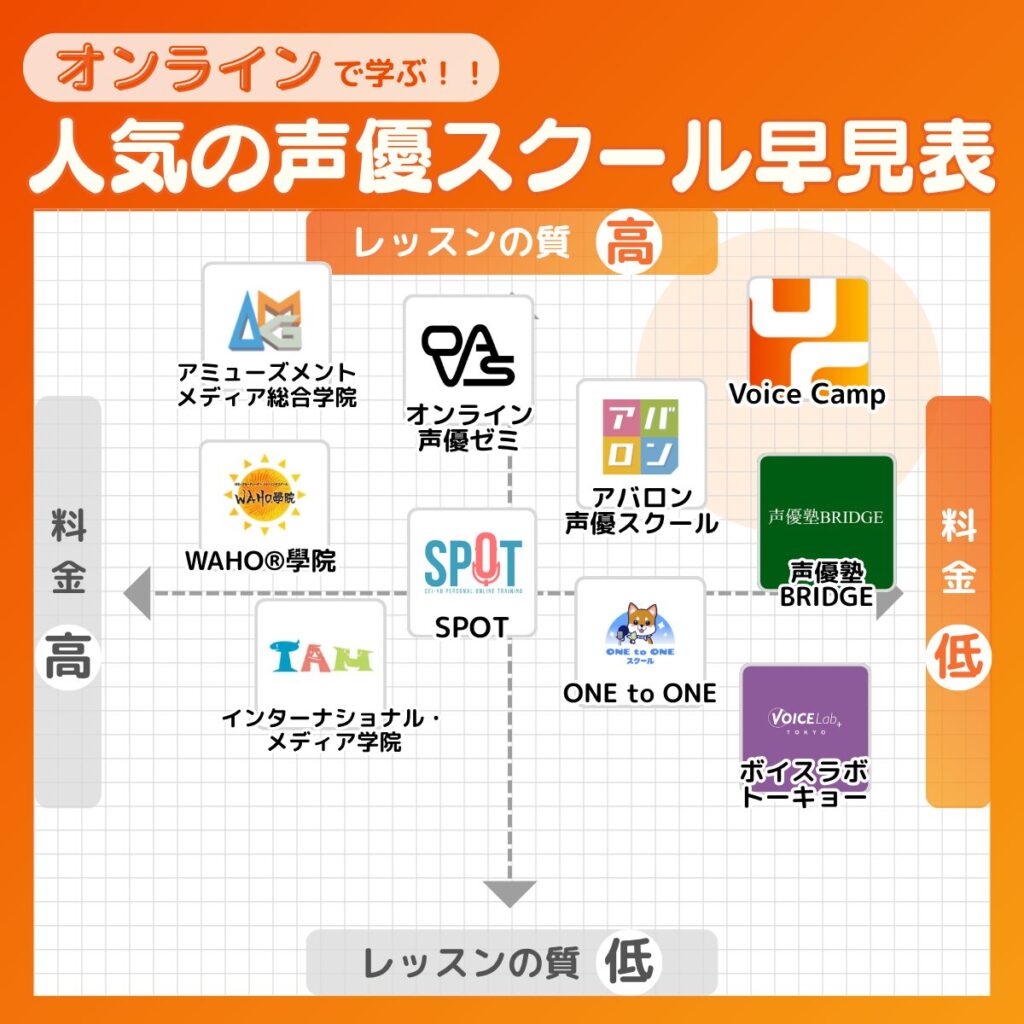 | ボイスラボトーキョー | ![]() | 声優・俳優養成機関 | 声優・俳優を目指す人向け | 受講料55,000円 | グループレッスン | ベテラン講師陣 | 発音アクセントや表現などの知識 | なし |