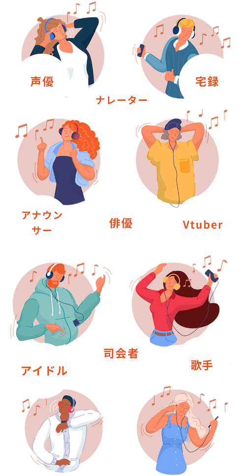 声優/ナレーター養成所の特待生、フリーの宅録ナレーター、声優の専門学生、事務所所属のVtuber、番組のラジオパーソナリティ、劇団俳優、アナウンススクール生、芸能事務所のアイドルグループ、事務所所属のライブ配信者、ライトノベル作家、フリーの司会者、芸能業界の音響スタッフなど...