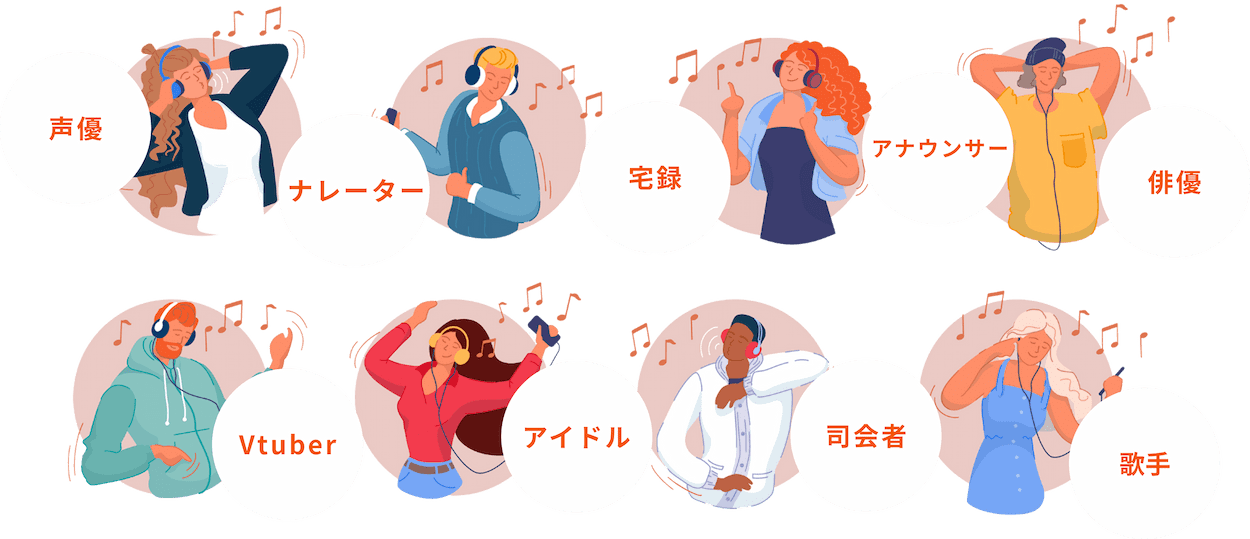 声優/ナレーター養成所の特待生、フリーの宅録ナレーター、声優の専門学生、劇団俳優事務所所属のVtuber、番組のラジオパーソナリティ、芸能事務所のアイドルグループ、ライトノベル作家など...